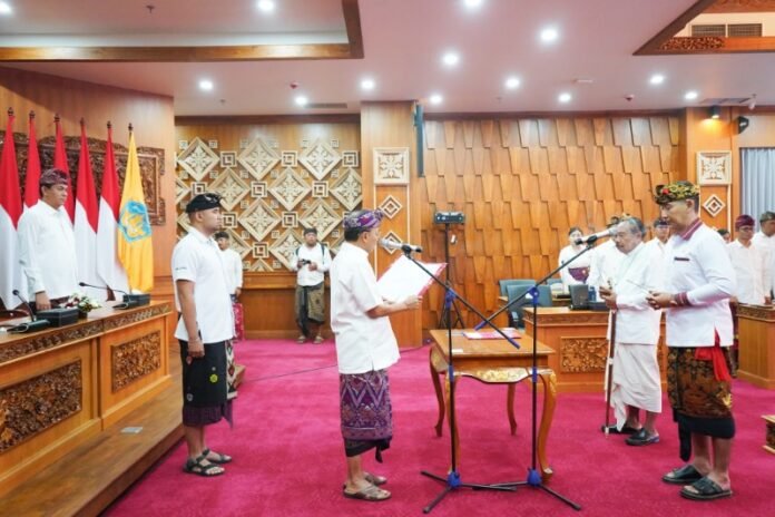 Acara pelantikan dan pengambilan sumpah jabatan/janji jabatan Kadisdikpora Provinsi Bali dihadiri Ketua DPRD Bali Dewa Made Mahayadnya, Sekda Provinsi Bali Dewa Made Indra dan Pimpinan OPD di Lingkungan Pemprov Bali.